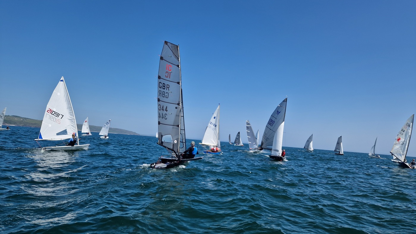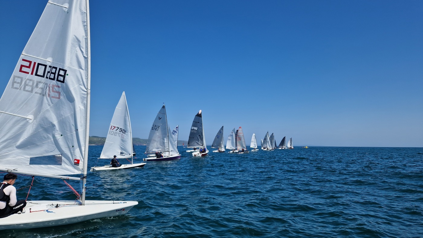 Perfect day’s weather for sailing, maybe the Southerly winds dropping a little light during the afternoon but another day of great racing with 50 boats on the tightish start line. A couple of individual recalls on the gun but there was a great view as the fleet headed towards Monkstone point before beating out towards Pendine and a run to Amroth.