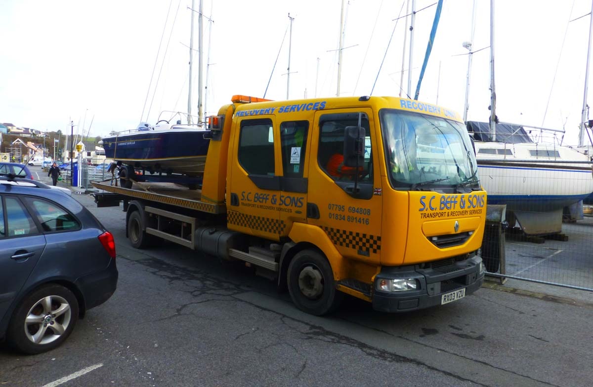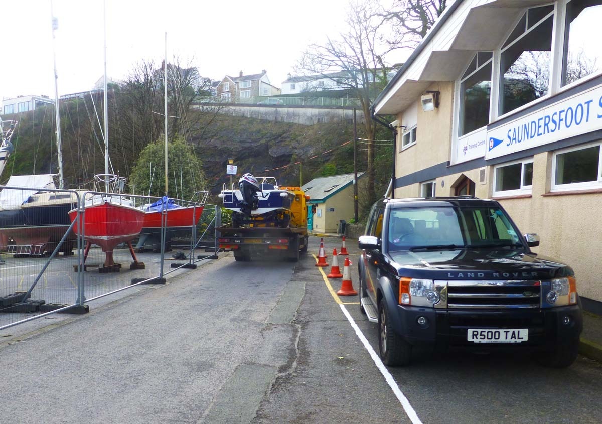 Then of course there is all the work going on to organise the fleet of rescue boats ready to start the season in tip top condition and one at least with a new engine. Here is the Flyer being delivered back from Pembrokeshire Sports Boats after some TLC and an engine maintenance.