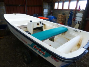 Went to see how the tired old Dory is coming along in it's restoration over at Pembrokshire Sports Boats. After 4 coats of oxalyc acid and the removal of enough mussles and barnacles to feed 10 people at the seaside cafe it is slowly taking shape. The console has been moved to the middle, all the damaged cables have been removed to be replaced including the broken steering wheel, new bilge pump to be fitted so no more emptying the boat out every week of... 20 gallon of water, a new 30 HP 4 stroke Tohatsu engine to be fitted, the seat raised and new cusion fitted with a small drinks table to hold a couple of G&T's to be fitted on the fore deck for when the wind drops.
