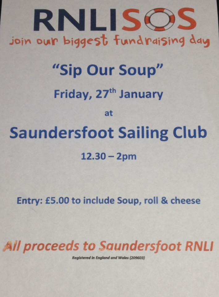 Don't forget if you can spare some time pop along to the sailing club from 12.30 to 2.00 where the RNLI branch will be serving delicious hot soup with cheese and a roll and what better cause to support - THIS COMING FRIDAY !!